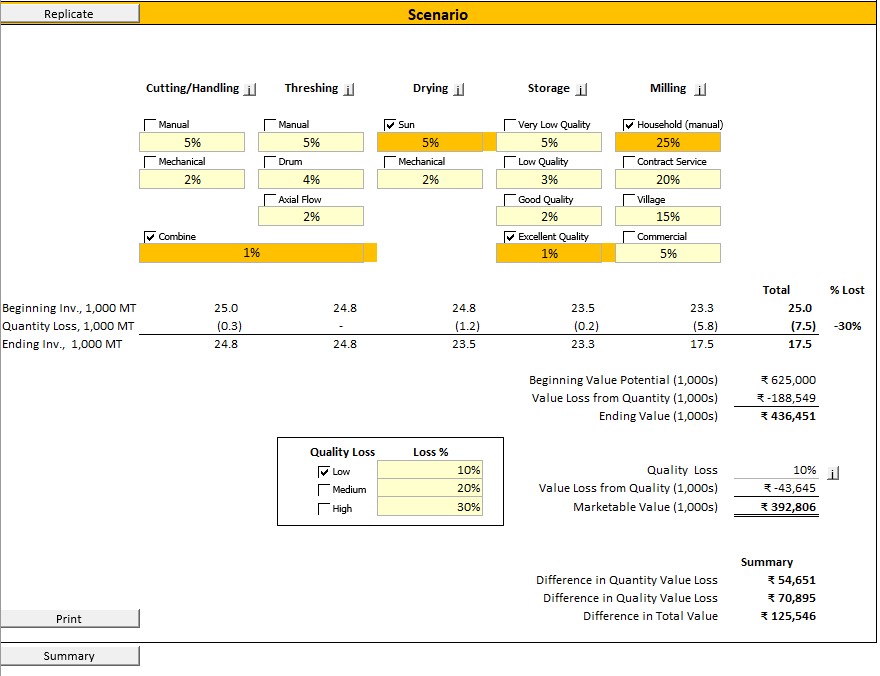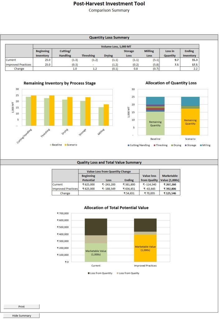 After setting the parameters for the scenario, viewing the summary allows users to see a complete view of the impact of possible changes upon the postharvest loss situation.