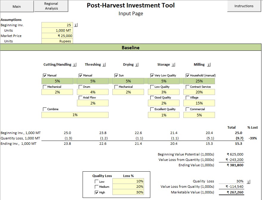 The tool’s design allows users to explore different scenarios for reducing losses at different stages of the value chain across a district or an entire region.